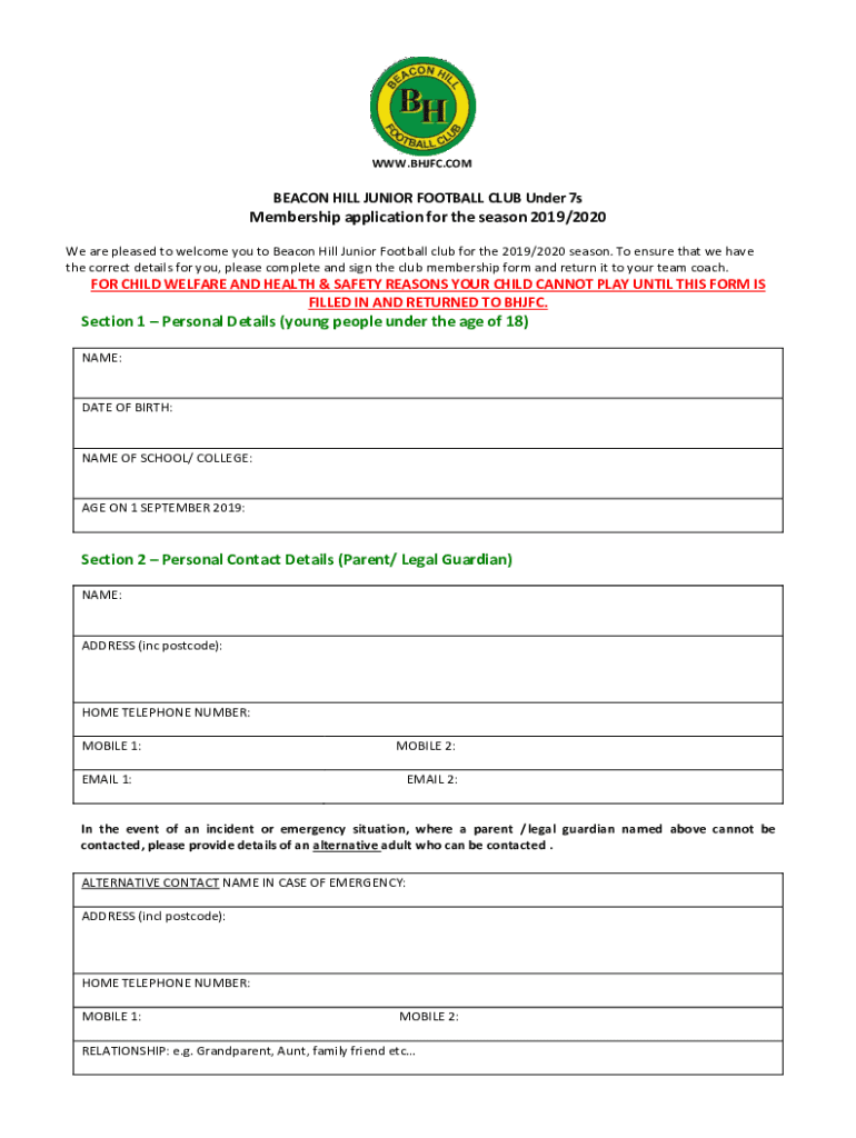 WWW.HFC.COMECON HILL JUNIOR FOOTBALL CLUB Under 7sMembership application for the season 2019/2020 We are pleased to welcome you to Beacon Hill Junior Football club for the 2019/2020 season. To ensure