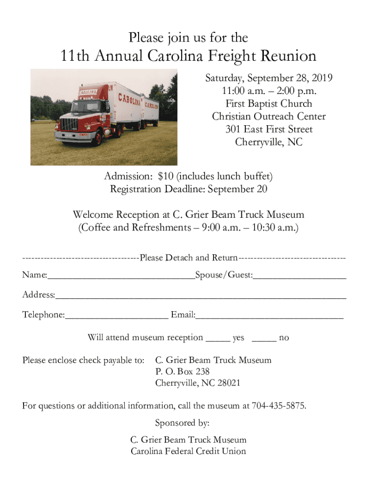 Resettles join us for the11th Annual Carolina Freight Reunion Saturday, September 28, 2019 11:00 a.m. 2:00 p.m. First Baptist Church Christian Outreach Center 301 East First Street Perryville, NC