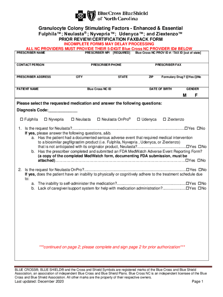 Granulocyte Colony Stimulating Factors Enhanced & Essential Fulfill; ; Nigeria; Deny; and Ziextenzo PRIOR REVIEW/CERTIFICATION FATBACK FORM INCOMPLETE FORMS MAY DELAY PROCESSING ALL NC PROVIDERS MUST