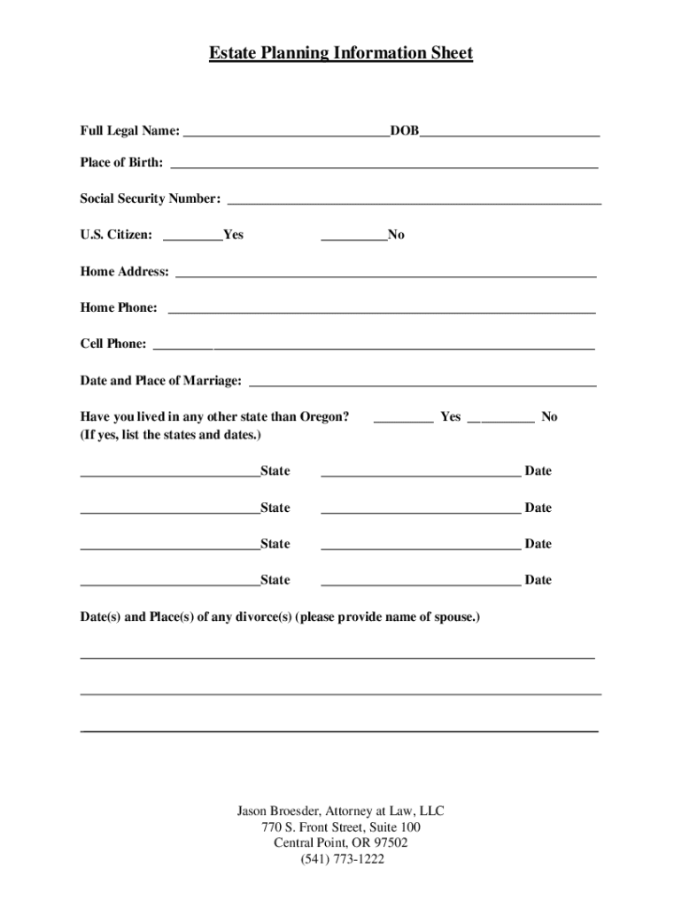 Estate Planning Information Cheerful Legal Name: DOB Place of Birth: Social Security Number: U.S. Citizen: Yes Home Address: Home Phone: Cell Phone: Date and Place of Marriage: Have you lived in any