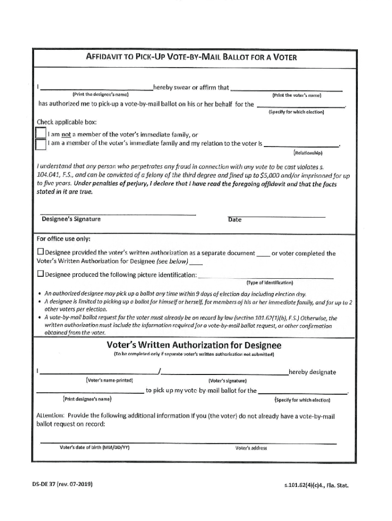 AFFIDAVIT TO PICKUP VOTEBYMAIL BALLOT FOR A VOTERS hereby swear or affirm that (Print the designee's name)(Print the voter's name)has authorized me to pick up a votebymail ballot on his or her behalf