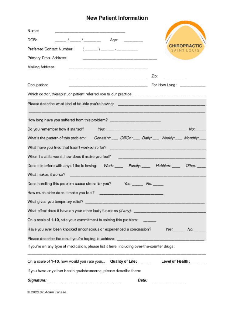 New Patient Information Name: DOB: / / Age: Preferred Contact Number:() Primary Email Address: Mailing Address:Occupation: Zip: For How Long: Which doctor, therapist, or patient referred you to our