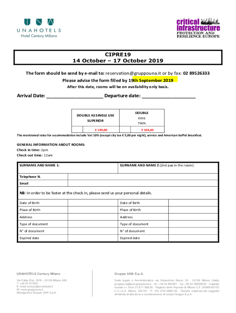 CIPRE19 14 October 17 October 2019 The form should be sent by email to: reservation gruppouna.it or by fax: 02 89526333 Please advise the form filled by 19th September 2019 After this date, rooms
