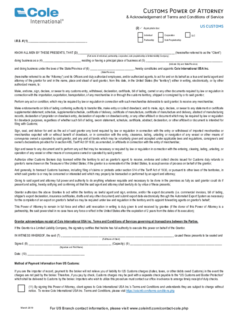 Customs Power of Attorney & Acknowledgement of Terms and Conditions of Service US CUSTOMS(2) P Appropriate box:I.R.S. # (1) IndividualCorporationPartnershipSole ProprietorshipLLCKNOW ALL MEN BY THESE