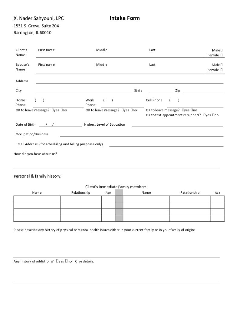 Intake Form. Nader Mahjouri, LPC 1531 S. Grove, Suite 204 Barrington, IL 60010Clients NameFirst nameMiddleLastMale Female Spouses NameFirst nameMiddleLastMale Female Address CityStateHome () Phone