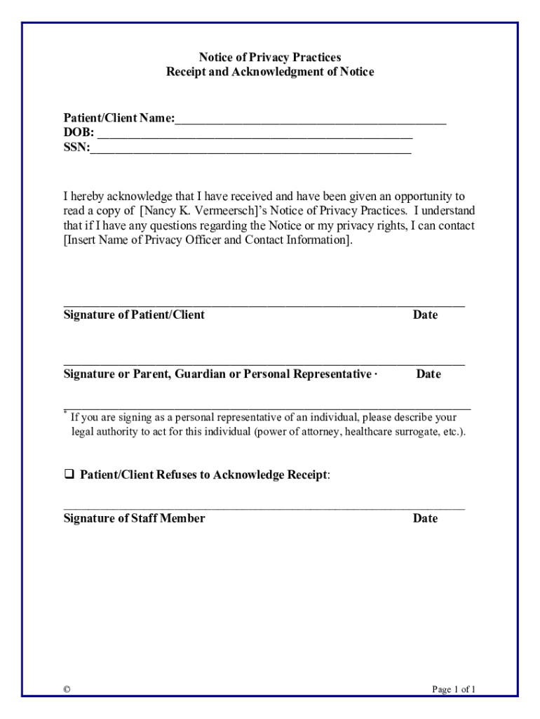 Notice of Privacy Practices Receipt and Acknowledgment of NoticePatient/Client Name: DOB: SSN: I hereby acknowledge that I have received and have been given an opportunity to read a copy of Nancy