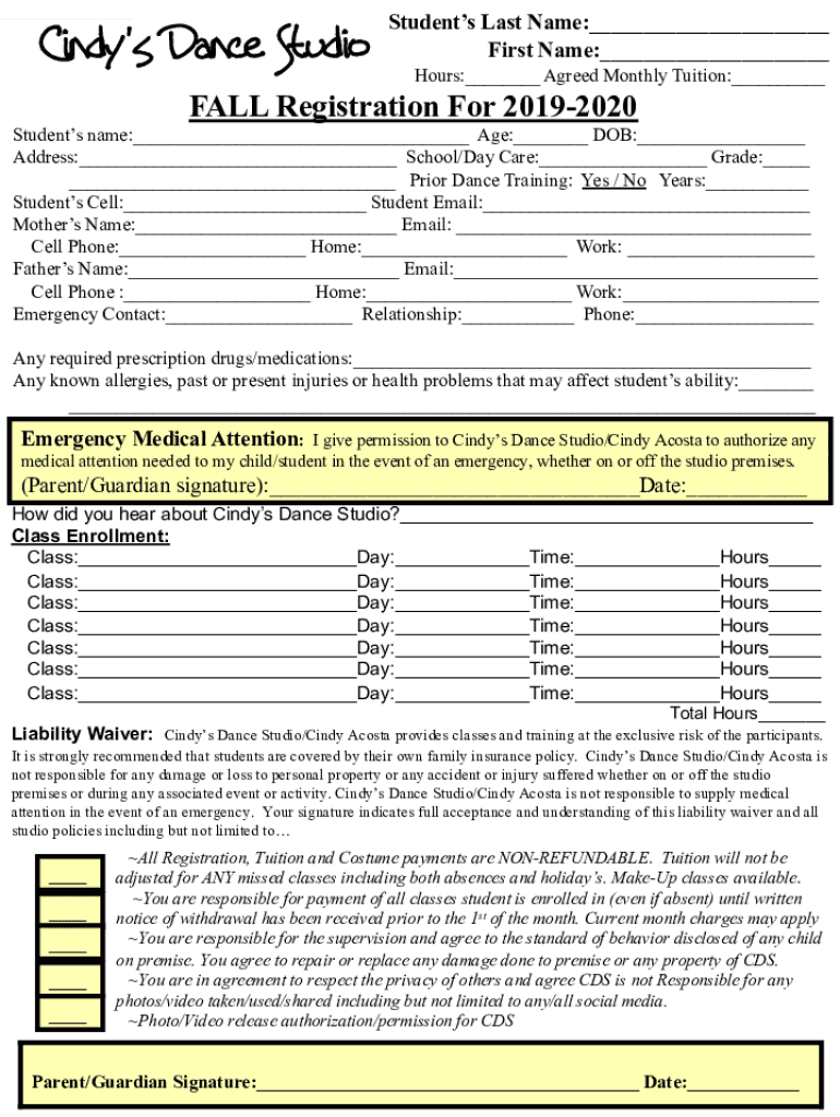 Cindy's Dance StudioStudents Last Name: First Name: Hours: Agreed Monthly Tuition: FALL Registration For 20192020 Students name: Age: DOB: Address: School/Day Care: Grade: Prior Dance Training: Yes