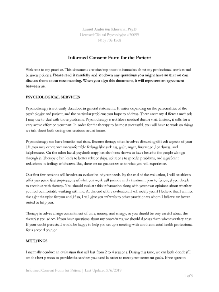 Laurel Anderson Khorana, PSD Licensed Clinical Psychologist #30099 (415) 7021568 Informed Consent Form for the Patient Welcome to my practice. This document contains important information about my