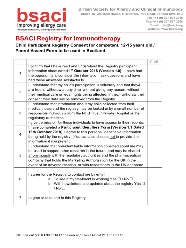 Get the free BRIT Consent Form Scotland Child parent v1.1 161018 Scotland.doc