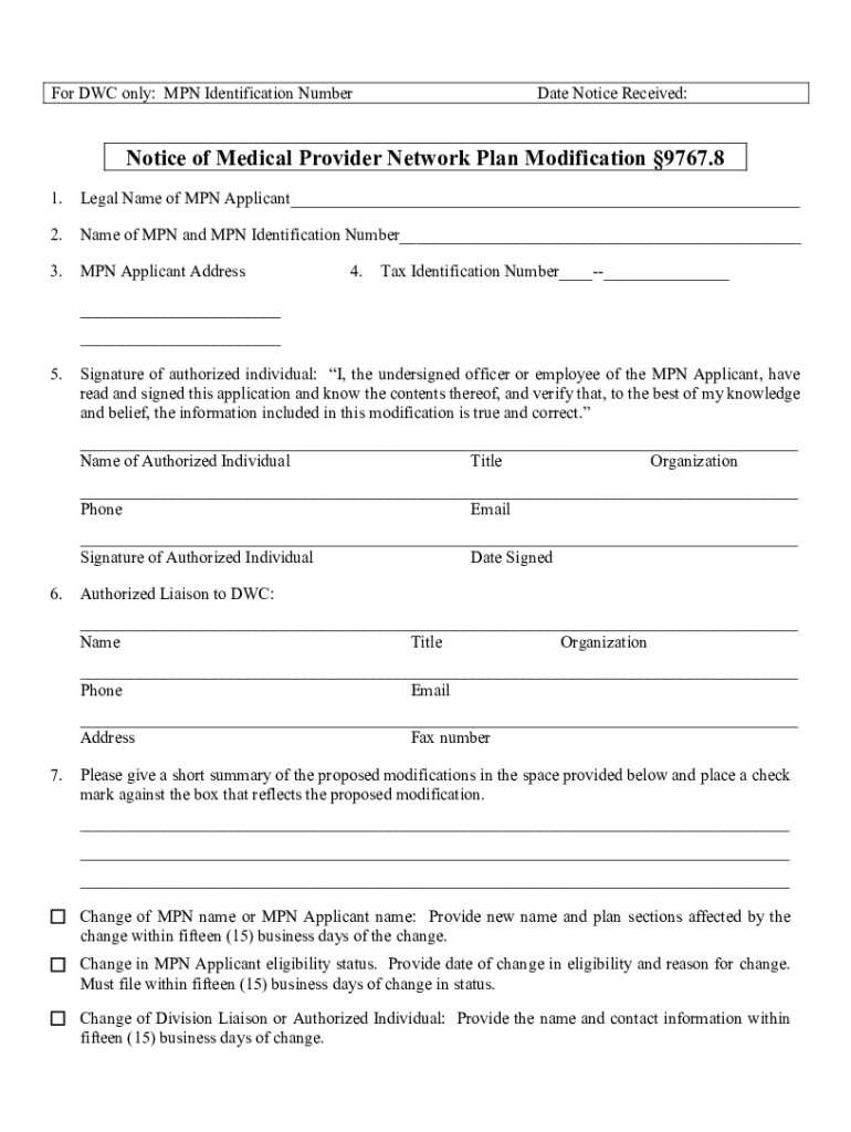PRINT Clearer DWC only: MPN Identification Numerate Notice Received:Notice of Medical Provider Network Plan Modification 9767.8 1. Legal Name of MPN Applicant 2. Name of MPN and MPN Identification