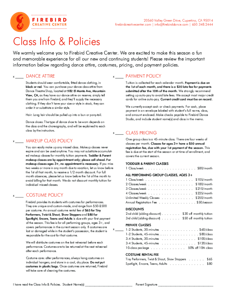 20560 Valley Green Drive, Cupertino, CA 95014 firebirdcreativecenter.com info firebirddance.com 650.348.2444Class Info & Policies We warmly welcome you to Fire bird Creative Center. We are excited