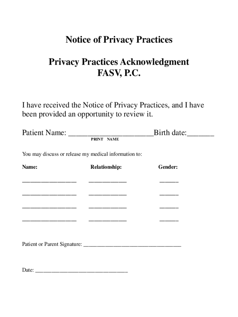 Notice of Privacy Practices Acknowledgment FAST, P.C. I have received the Notice of Privacy Practices, and I have been provided an opportunity to review it. Patient Name: Birth date: PRINT Name may