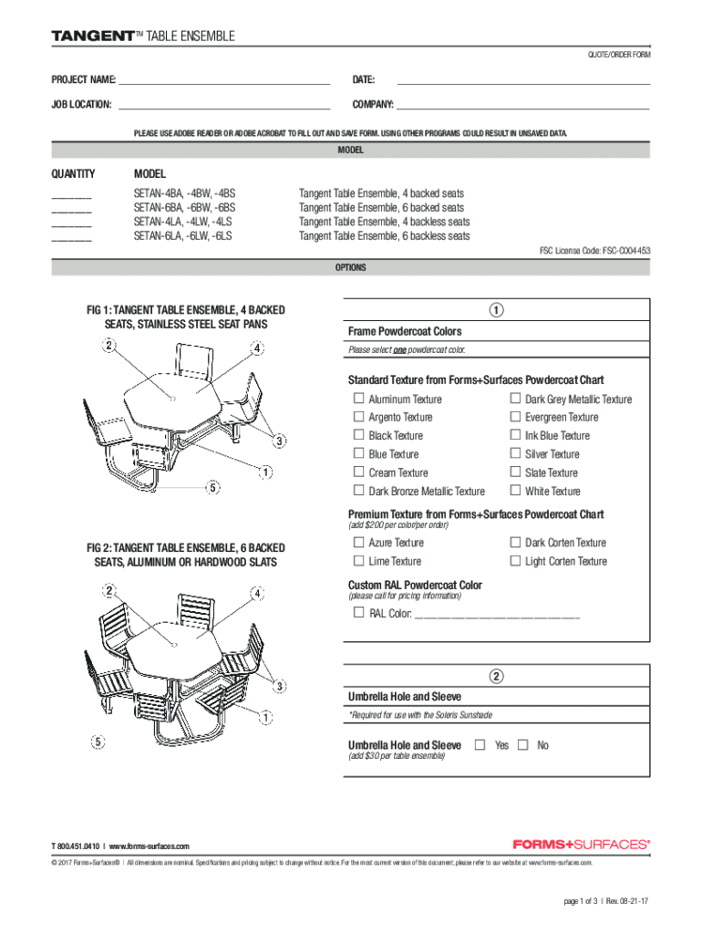 TANGENT TM TABLE ENSEMBLE QUOTE/ORDER FORMPROJECT NAME: DATE: JOB LOCATION: COMPANY: PLEASE USE ADOBE READER OR ADOBE ACROBAT TO FILL OUT AND SAVE FORM. USING OTHER PROGRAMS COULD RESULT IN UNSAVED