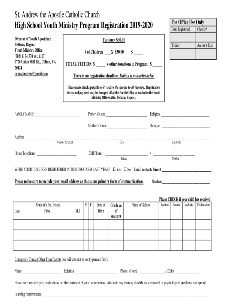 St. Andrew the Apostle Catholic Church High School Youth Ministry Program Registration 20192020 Director of Youth Postulate Bethany Rogers Youth Ministry Office: (703) 8171770 ext. 1107 6720 Union