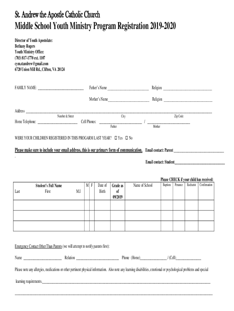 St. Andrew the Apostle Catholic ChurchMiddle School Youth Ministry Program Registration 20192020 Director of Youth Postulate: Bethany Rogers Youth Ministry Office: (703) 8171770 ext. 1107 CYM. Andrew