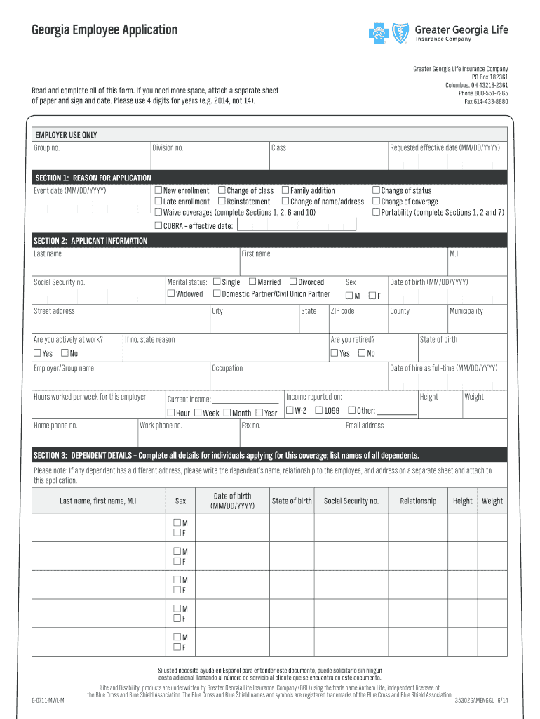 The Georgia Employee Application can be completed by current employees, their spouses, or domestic partners who are applying for employment-related benefits like life and disability insurance.
