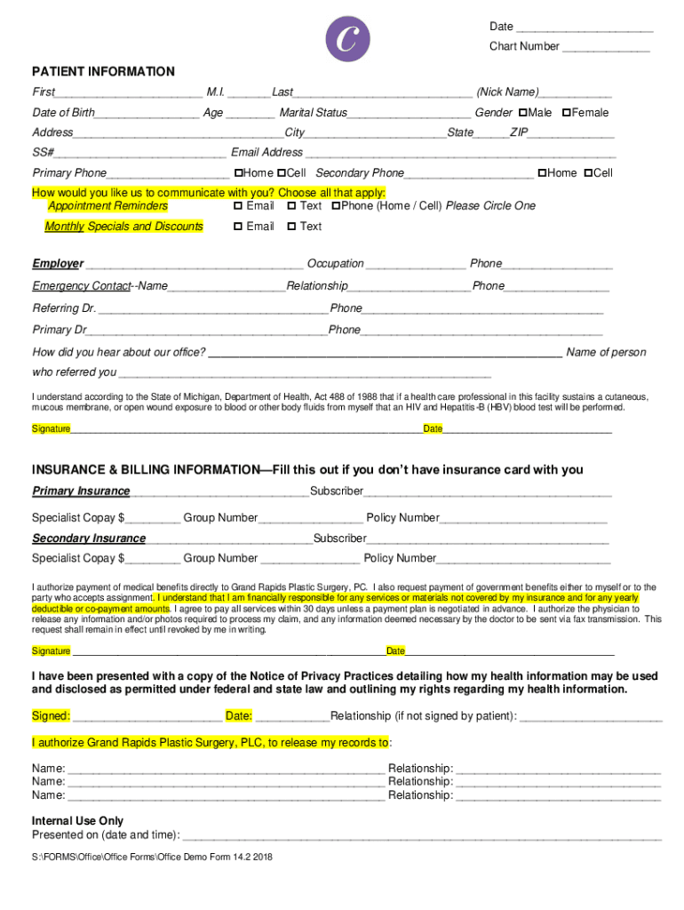 Date Chart Number PATIENT INFORMATION First M.I. Last (Nick Name) Date of Birth Age Marital Status Gender Male Female Address City State ZIP SS# Email Address Primary Phone Home Cell Secondary Phone