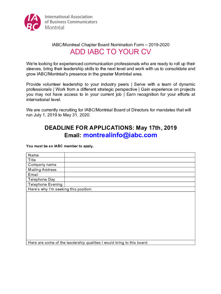 IAC/Montreal Chapter Board Nomination Form 20192020ADD IAC TO YOUR CV We're looking for experienced communication professionals who are ready to roll up their sleeves, bring their leadership skills