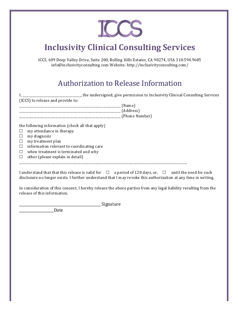 Inclusivity Clinical Consulting ServicesICCS, 609 Deep Valley Drive, Suite 200, Rolling Hills Estates, CA 90274, USA 310.594.9605info inclusivityconsulting.com Website: http://inclusivityconsulting.com/Authorization