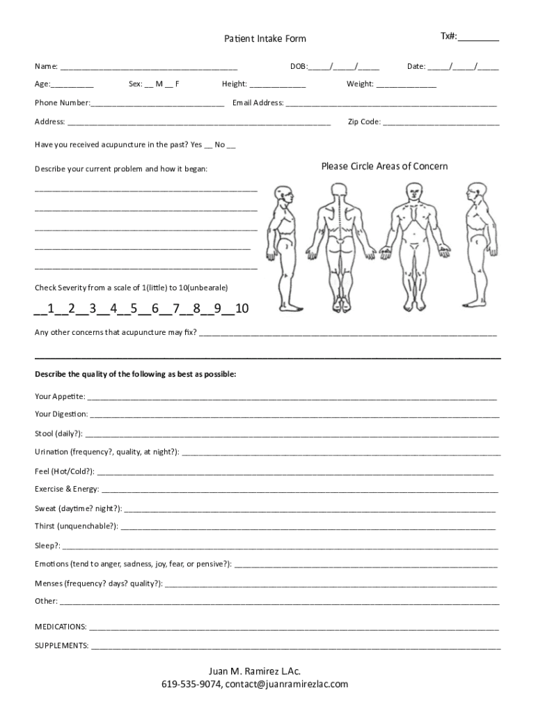 TX#: Pa#entIntakeFormName: DOB: / / Date: / / Age: Sex: MF Height: Weight: PhoneNumber: Misaddress: Address: Opcode: Haveyoureceivedacupunctureinthepast? Yes No Describeyourcurrentproblemand.