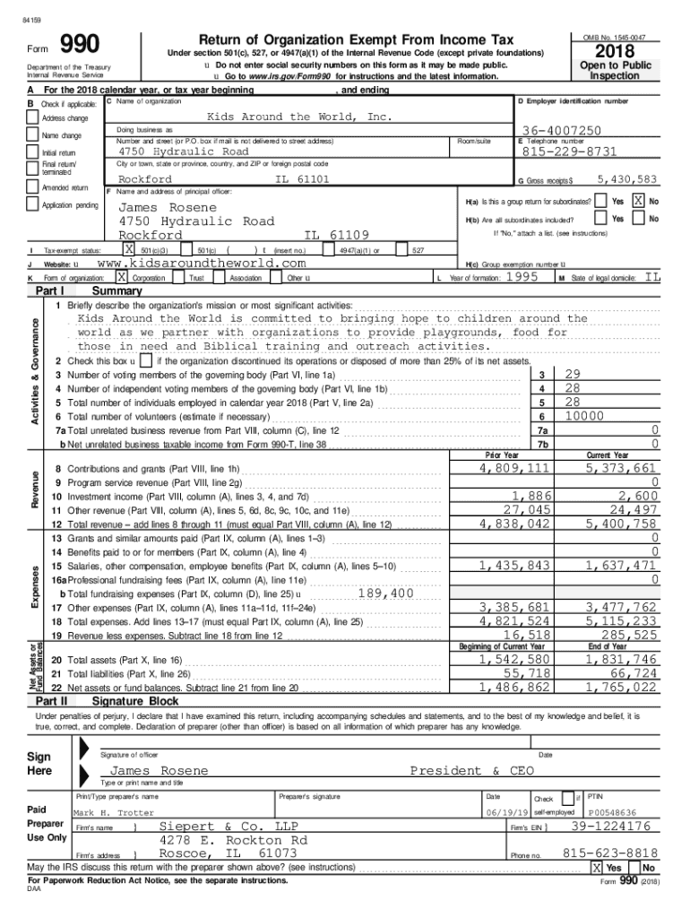 84159990FormReturn of Organization Exempt From Income Taxa For the 2018 calendar year, or tax year beginning