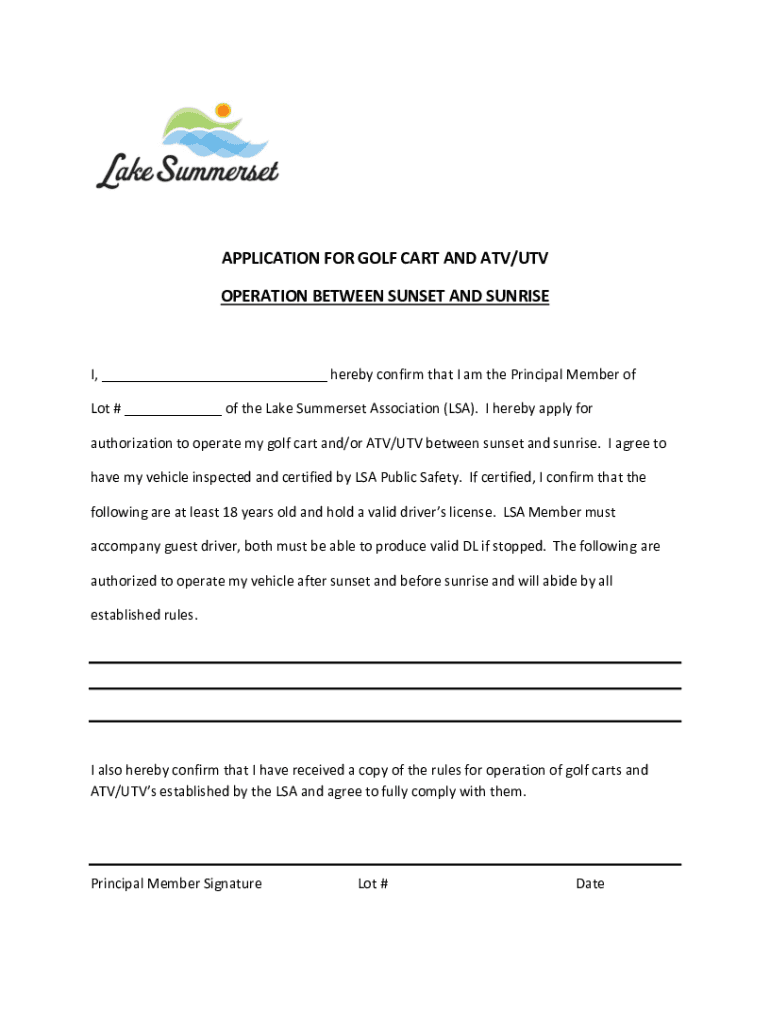 APPLICATION FOR GOLF CART AND ATV/UTV OPERATION BETWEEN SUNSET AND SUNRISE, hereby confirm that I am the Principal Member of Lot # of the Lake Summer set Association (LSA). I hereby apply for authorization
