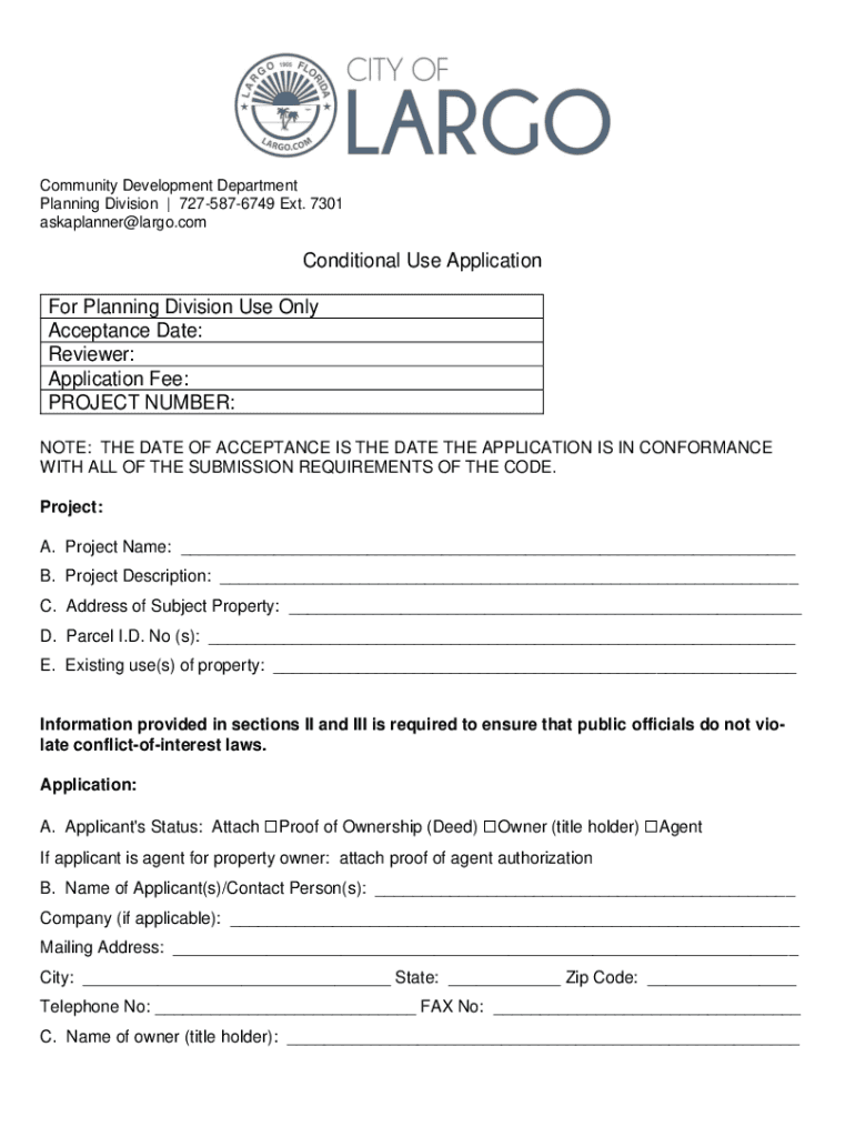 Community Development Department Planning Division 7275876749 Ext. 7301 askaplanner largo. Conditional Use Application For Planning Division Use Only Acceptance Date: Reviewer: Application Fee: PROJECT