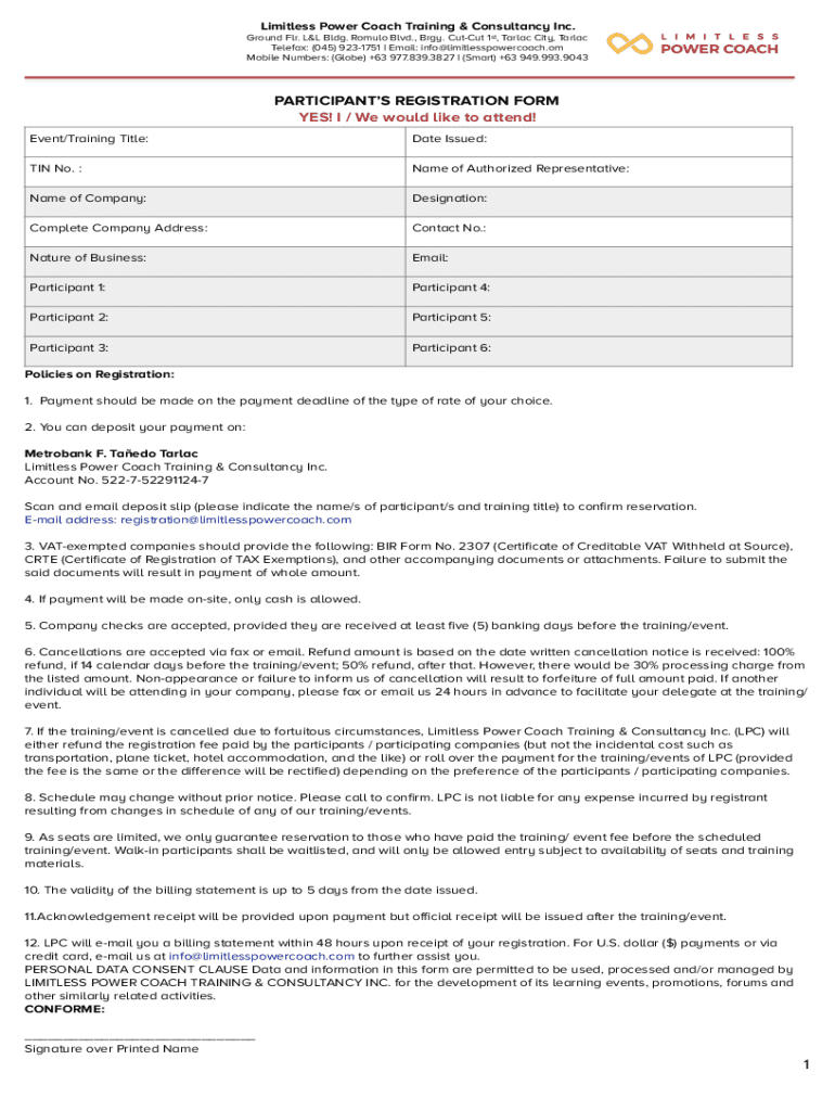 Limitless Power Coach Training & Consultancy Inc. Ground FLR. L&L Bldg. Romeo Blvd., Bray. Cutout 1st, Tarmac City, Tarmac Telefax: (045) 9231751 Email: info limitlesspowercoach. On Mobile Numbers: