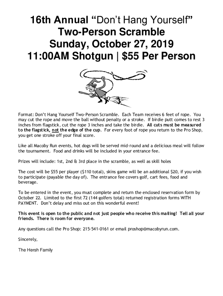 16th Annual Don't Hang Yourself Person Scramble Sunday, October 27, 2019 11:00AM Shotgun $55 Per PersonFormat: Don't Hang Yourself Person Scramble. Each Team receives 6 feet of rope. You may cut the