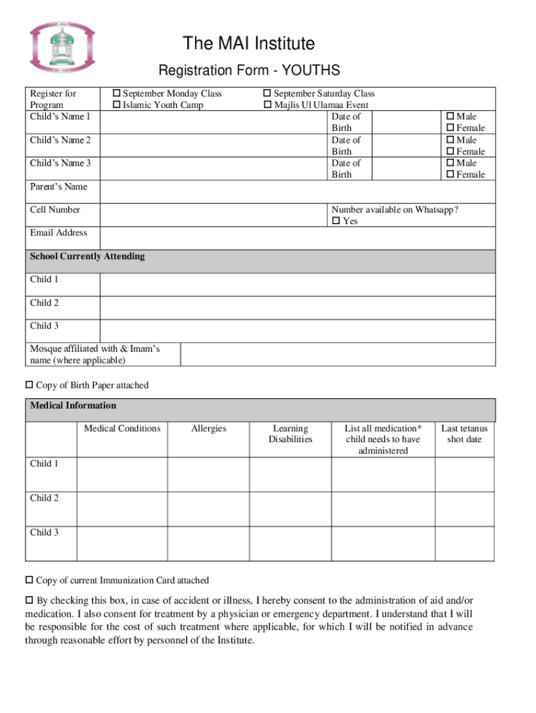 The MAI Institute Registration Form YOUTHS Register for Program Child's Name 1 September Monday Class Islamic Youth Campaniles Name 2 Childs Name 3 September Saturday Class Males UL Lamar Event Date