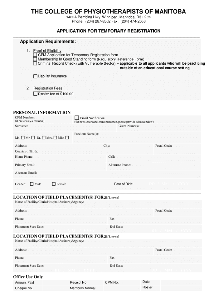THE COLLEGE OF PHYSIOTHERAPISTS OF MANITOBA 1465A Remain Hwy, Winnipeg, Manitoba, R3T 2C5 Phone: (204) 2878502 Fax: (204) 4742506APPLICATION FOR TEMPORARY REGISTRATION Application Requirements: 1.