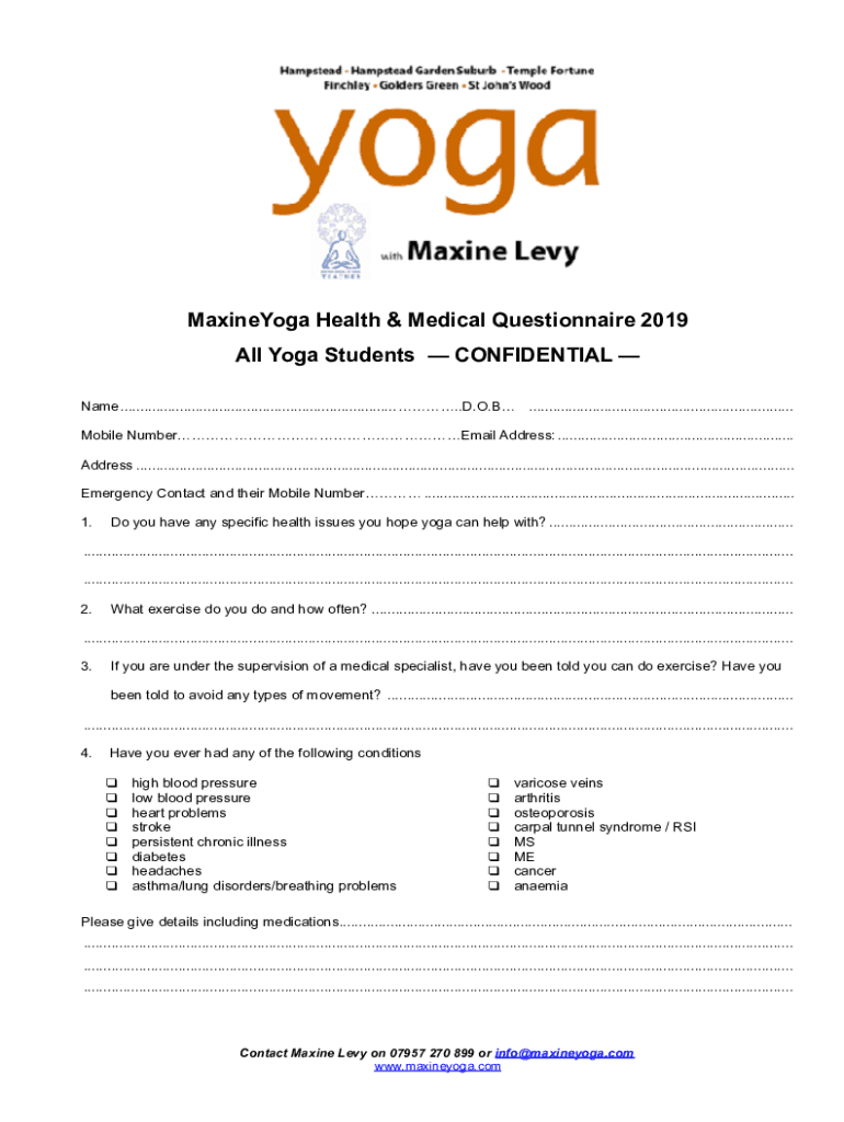 ! MaxineYoga Health & Medical Questionnaire 2019 All Yoga Students CONFIDENTIAL Name ...................................................................... .. D.O.B...................................................................