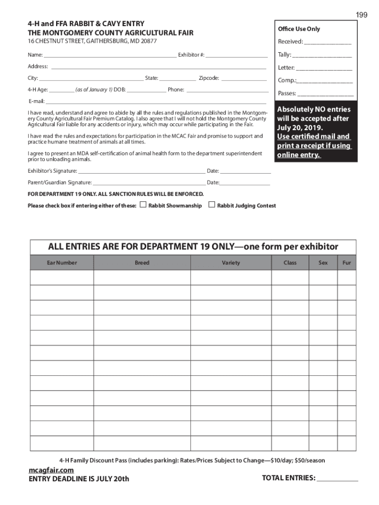1994H and FFA RABBIT & NAVY ENTRY THE MONTGOMERY COUNTY AGRICULTURAL FAIROffice Use Only16 CHESTNUT STREET, GAITHERSBURG, MD 20877Received: Name: Exhibitor #: Tally: Address: Letter: City: State:
