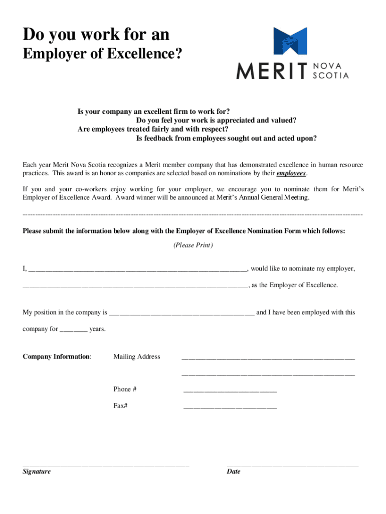 Get the free Do you work for an Employer of Excellence? - Merit Nova Scotia