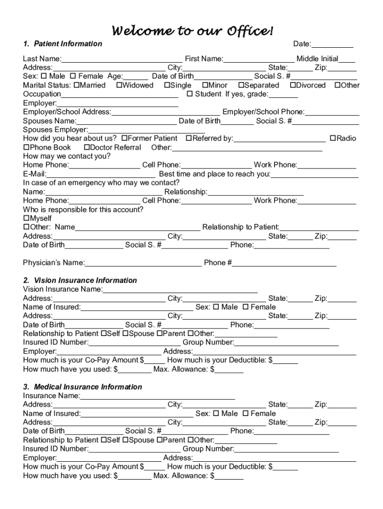 Welcome to our Office! 1. Patient Informational: Last Name: First Name: Middle Initial Address: City: State: Zip: Sex: o Male o Female Age: Date of Birth Social S. # Marital Status: married widowed
