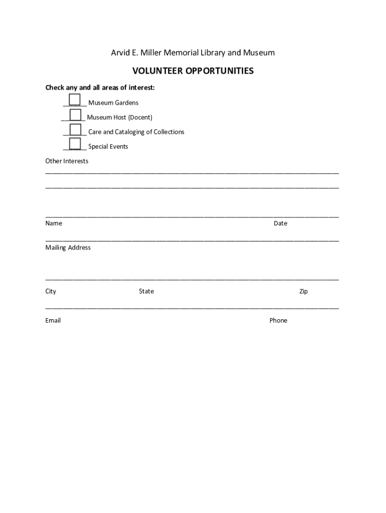 Arid E. Miller Memorial Library and MuseumVOLUNTEER OPPORTUNITIES Check any and all areas of interest: Museum Gardens Museum Host (Docent) Care and Cataloging of Collections Special Events Other Interests