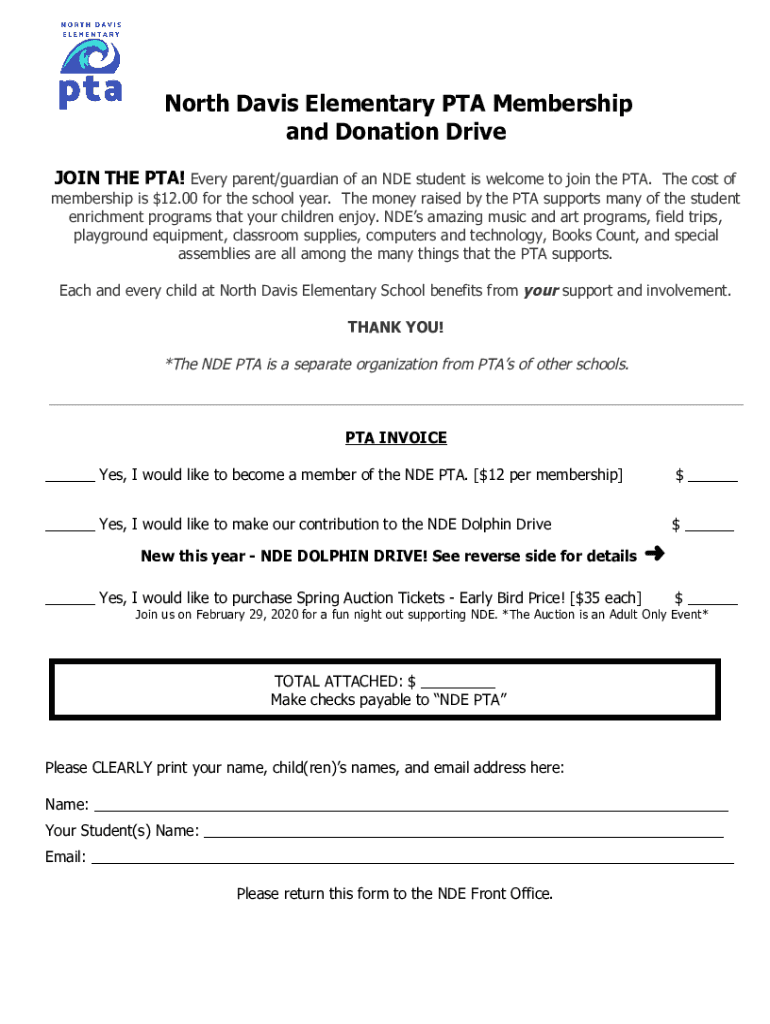 JOIN THE PTA! Every parent/guardian of an NODE student is welcome to join the PTA. The cost of membership is $12.00 for the school year. The