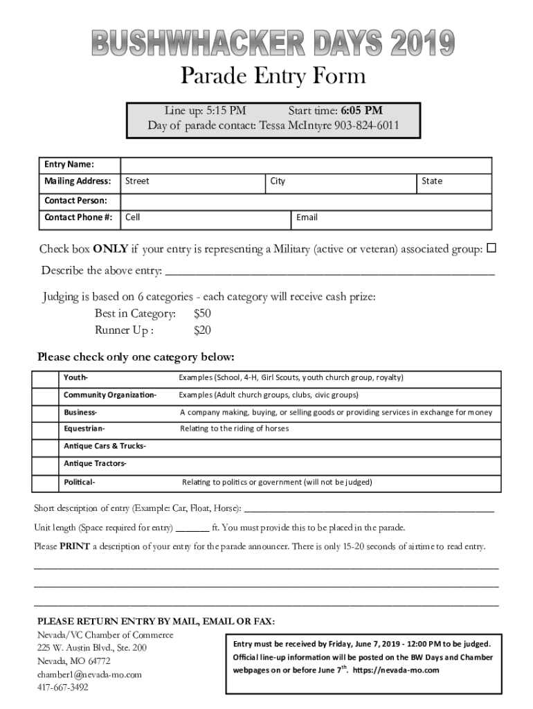 Parade Entry Form Line up: 5:15 PM Start time: 6:05 PM Day of parade contact: Tessa McIntyre 9038246011 Entry Name: Mailing Address:StreetCityStateContact Person:Contact Phone #:CellEmailCheck box