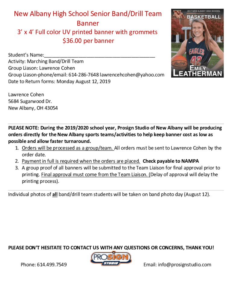 New Albany High School Senior Band/Drill TeamBanner3 x 4 Full color UV printed banner with grommets$36.00 per bannerStudents Name: Activity: Marching Band/Drill Newsgroup Liaison: Lawrence CompuGroup