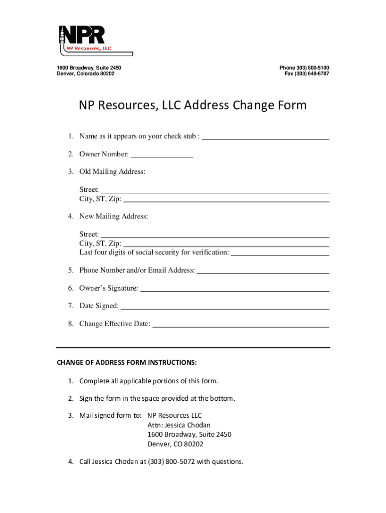Fax (303) 6486787NP Resources, LLC Address Change Form