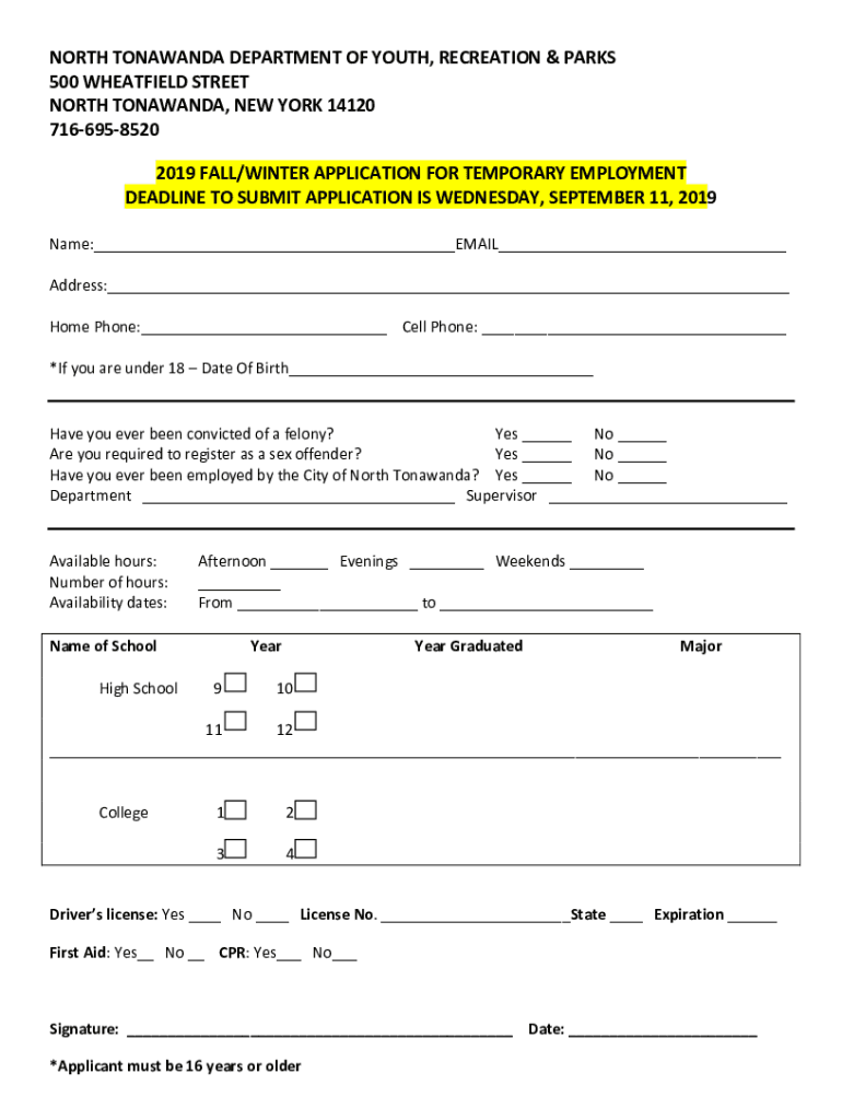 NORTH LAWANDA DEPARTMENT OF YOUTH, RECREATION & PARKS 500 HATFIELD STREET NORTH LAWANDA, NEW YORK 14120 7166958520 2019 FALL/WINTER APPLICATION FOR TEMPORARY EMPLOYMENT DEADLINE TO SUBMIT APPLICATION
