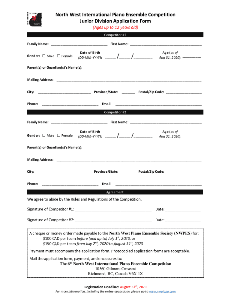 North West International Piano Ensemble Competition Junior Division Application Form (Ages up to 12 years old) Competitor #1 Family Name: First Name: Gender: Male Revalidate of Birth (DDMMYYYY): //Age