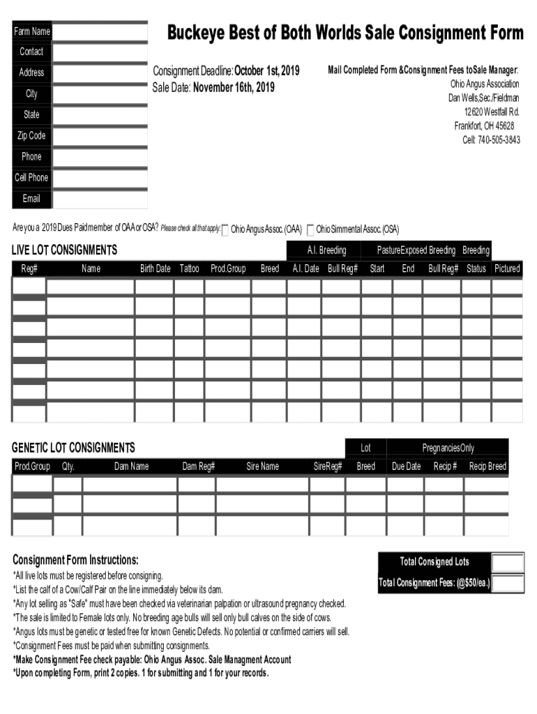 Buckeye Best of Both Worlds Sale Consignment Forearm Name ContactConsignment Deadline: October 1st, 2019 Sale Date: November 16th, 2019Address Ismail Completed Form consignment Fees total Manager: