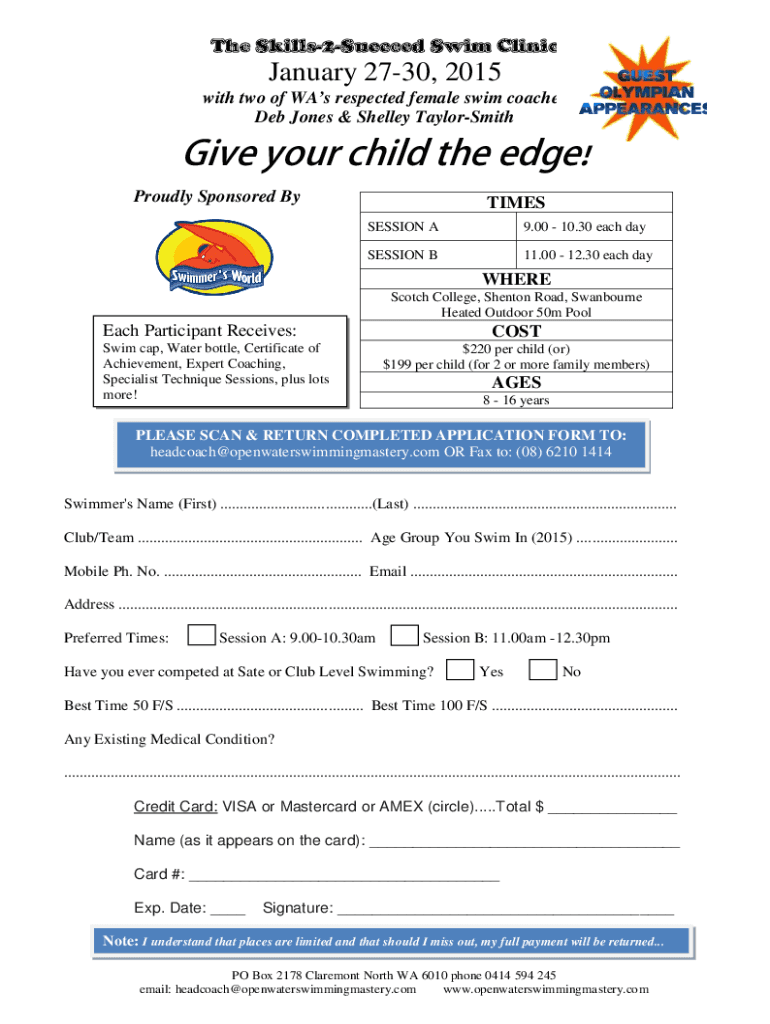 The Skills2Succeed Swim Clinic January 2730, 2015 with two of Was respected female swim coaches Deb Jones & Shelley TaylorSmithGive your child the edge! Proudly Sponsored Betimes SESSION A9.00 10.30