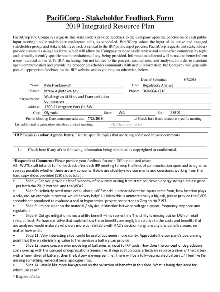 PacifiCorp Stakeholder Feedback Form 2019 Integrated Resource Plan PacifiCorp (the Company) requests that stakeholders provide feedback to the Company upon the conclusion of each public input meeting