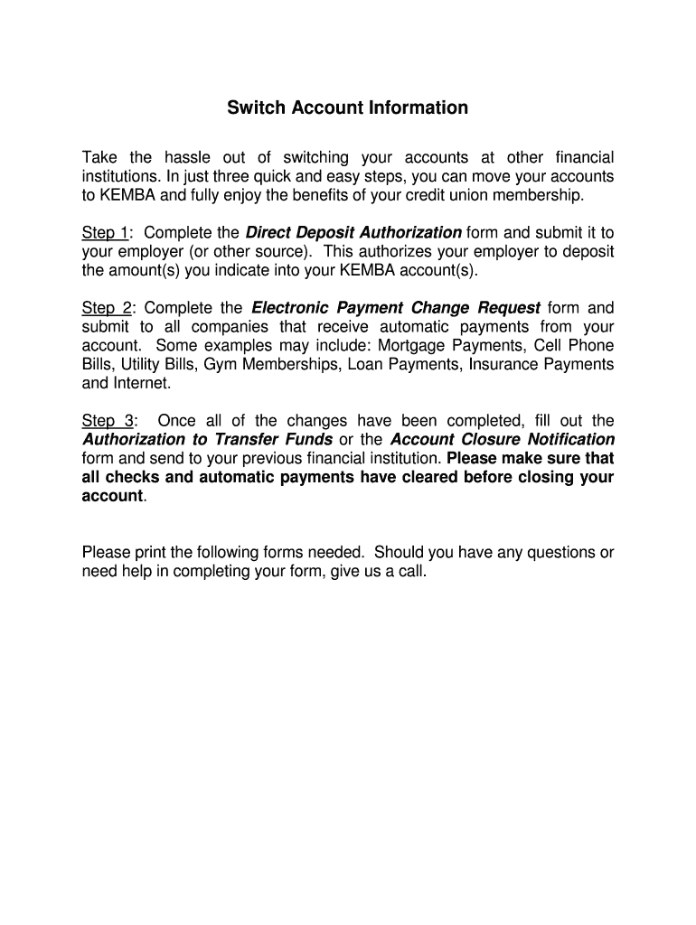 Individuals looking to transfer their banking services to KEMBA Peoria Credit Union are eligible to use the Switch Account Information form.