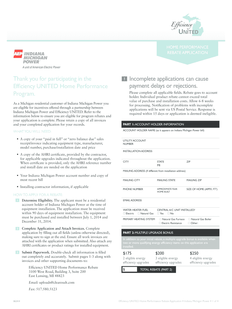 Eligibility for the Home Performance Rebate Application is primarily for Michigan residential customers of Indiana Michigan Power who have made energy-efficient home improvements. Ensure you meet specific program requirements and installation timelines.