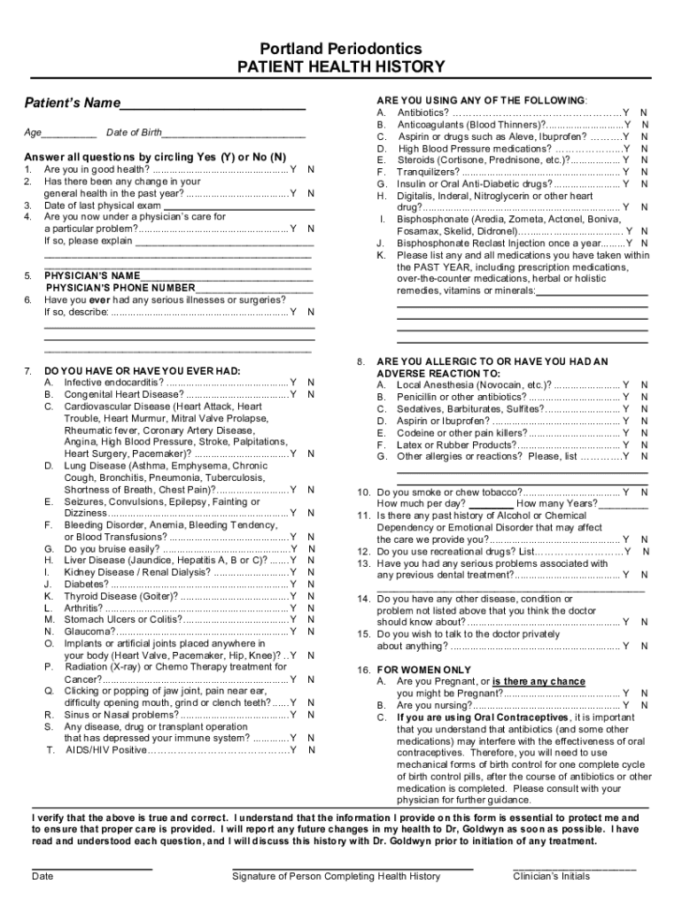 Portland Periodontics PATIENT HEALTH HISTORY Patients Name ARE YOU USING ANY OF THE FOLLOWING: A. Antibiotics? Y N B. Anticoagulants (Blood Thinners)?............................ Y N C. Aspirin or