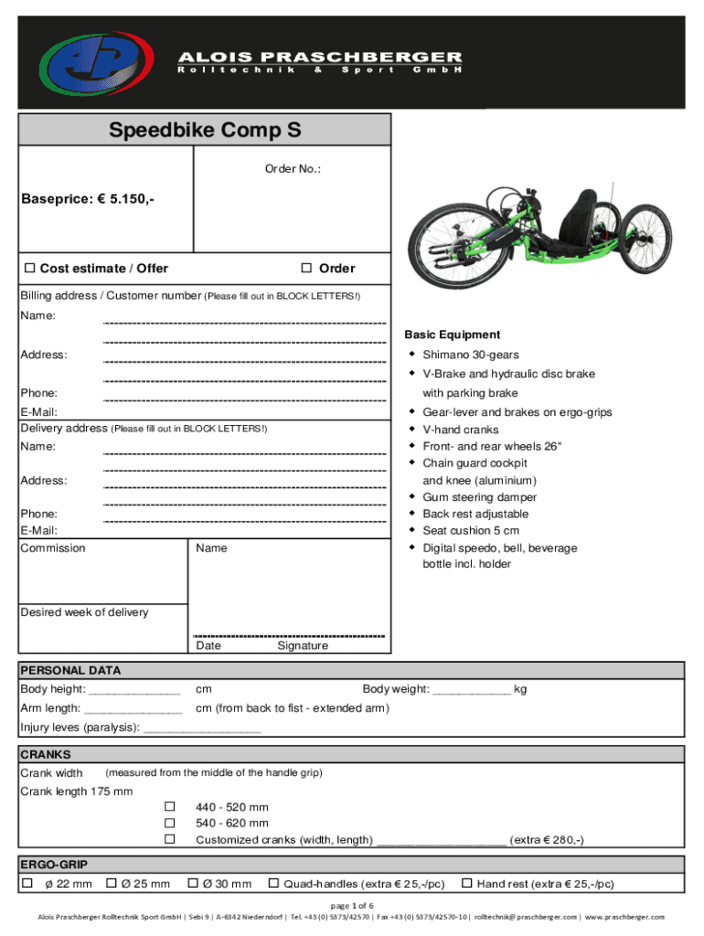 Speed bike Comp S Order No.:Base price: 5.150, Cost estimate / Offer Overfilling address / Customer number (Please fill out in BLOCK LETTERS!) Name: Basic Equipment Shaman 30gears w Brake and hydraulic