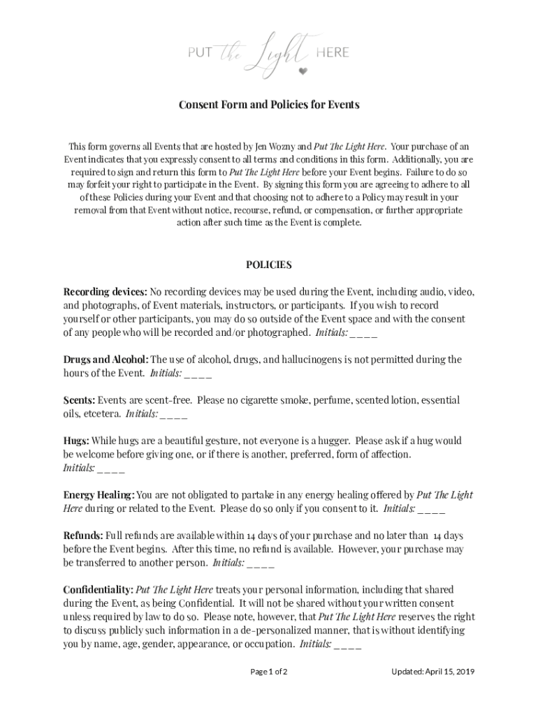 Consent Form and Policies for EventsThis form governs all Events that are hosted by Jen Won and Put The Light Here. Your purchase of an